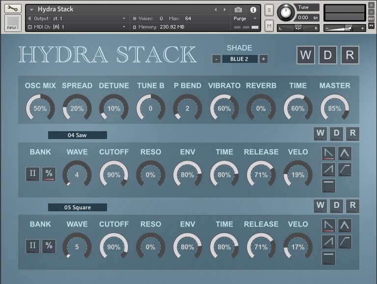 “Stack” Kontakt乐器被设计成一个简单的2个“振荡器”合成器,用于轻松创建/随机化声音,它部署了波形和时间方法来塑造音量和滤波器包络。我经常创建复杂的脚本,但我希望这个脚本简单易懂。