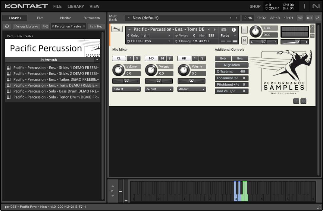 Performance Samples的Pacific Percussion Freebie是一个打击乐样本库,它提供了多种打击乐器的声音。这个库包括了从即将发布的PACIFIC库中的打击乐部分,PACIFIC库由四个部分组成:弦乐、铜管、木管和打击乐。