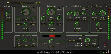 112dB Jaws是一款我们称之为“动态比特粉碎机”的效果插件,它具有你从高品质比特粉碎机中期望的一切:比特降低、采样率降低、前置放大器、输入和输出滤波器等等。但它还具有许多调制选项。你可以调制比特深度、采样率以及混合比。除此之外,Jaws还有一个可以调制的共振多模式滤波器。这意味着你可以用Jaws以通常的方式:通过降低比特深度或采样率,来增加80年代采样器的魅力。输入和输出滤波器、带有复古色彩的前置放大器和u-law噪声抑制,使得你可以更接近这种老派的声音1。或者用Jaws来完全摧毁你的声音,如果你更喜欢“工业”风格的话。但Jaws真正的亮点是,你可以用所有这些效果以一种创造性、流畅的方式。用包络跟踪器,你可以给你的音轨的响亮部分(或柔和部分)增加更多的噪音。LFO使得你可以创建各种奇怪的振荡效果。如果你用这个微妙地,你可以给声音增加一些“抖动”。在极端的设置下,你可以真正地突破天际,改变声音的面貌。