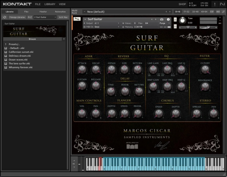Marcos Ciscar Surf Guitar 是一个为 Kontakt 设计的电吉他音源,灵感来自于冲浪音乐中的电吉他声音。这个音源提供了一系列在改变颤音杆时演奏的电吉他和弦,能够为您的制作添加一种冲浪的氛围。