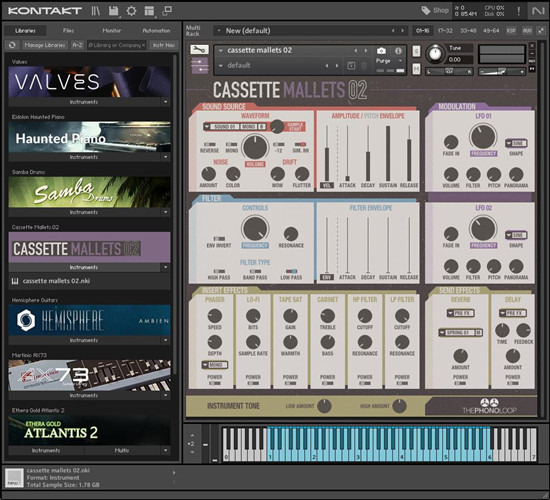 ThePhonoLoop Cassette Mallets.02包含三种乐器,每一种都覆盖了不同的声音领域。Sound 01是一种混合了旧钟琴片和薄钢板的声音,Sound 02是一个两个八度的木琴,混合了一些波纹板的共振,Sound 03是同样的木琴,但是使用了三个敲击器,它们附在一个旧床垫弹簧上,用铜线创建了一个随机的“颗粒”模式¹。所有的声音都通过额外的合成技术进行了调整,以获得更丰富的声音,并扩大它们在键盘上的范围。Sound 01和Sound 02包含5个动态层,而Sound 03包含4个动态层——所有的声音都使用3种不同的卡带录制。总共有2565个样本——每个卡带有305个样本用于Sound 01和Sound 02,244个样本用于Sound 03,另外还有每个卡带3个噪音样本(1.63 GB未压缩的24位WAV文件)。