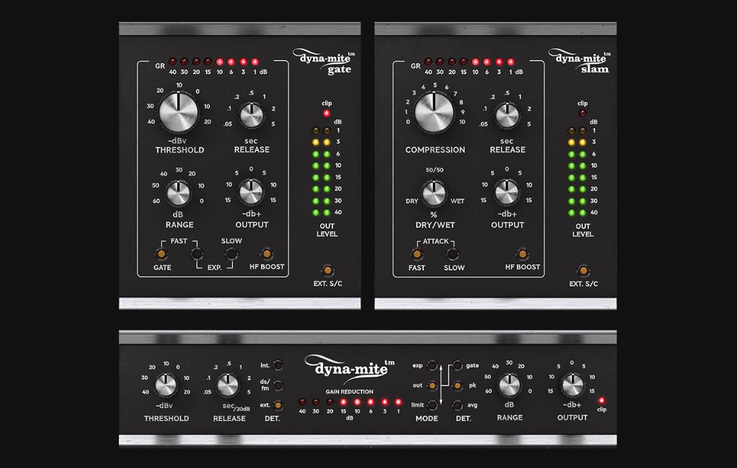 现在有了Dyna-mite Slam和Dyna-mite Gate插件,大家就可以直接得到这些奇妙的组合结果了。Dyna-miteSlam可以处理所有下行的工作:压缩和限制,有点接近单旋钮操作的形式。而Dyna-mite Gate则可以处理上行操作:门限和扩展。稍加调节即可为军鼓加入力度,让摇滚人声更服帖,或者让合成贝司的声音跟底鼓做抽吸ducking避让效果。所有这些功能都很直接不需要看说明书。