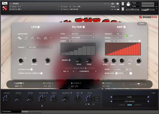 Soundiron Snack 是一个由 Soundiron 开发的免费的 Kontakt 音源,它使用了猫、狗、鸟、狮子、老虎、蟋蟀等动物的声音作为原始素材,经过创意的声音设计,生成了一些有趣而独特的音乐效果。