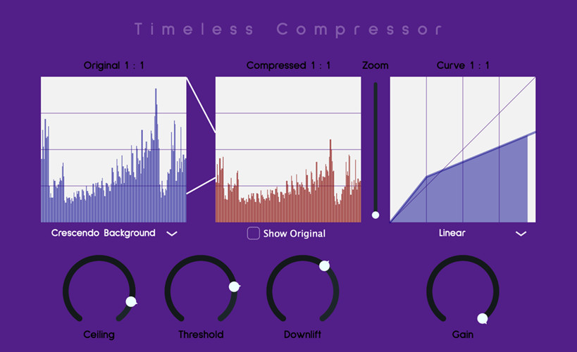 该插件采用现代动态范围压缩方法,专注于压缩本身而不是定时。结果是一个用户友好且易于理解的压缩机。它提供了三种不同的数学方法来压缩音频信号 - 线性,二次和贝塞尔 - 每种方法都可以选择扩展信号的最柔和部分。对于那些发现仅通过耳朵难以感知压缩的人,该插件还包括动画图形,以帮助可视化压缩过程。