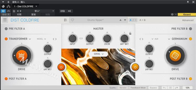 在Dist COLDFIRE插件中,有六个模拟风格的失真类型。磁带增加了磁带式的饱和度;电子管是一种阀门式的失真,"富含谐波";晶体管模仿经典的回声箱,以其对吉他旋律的出色反应而闻名;变压器是一种 "由磁滞创造的细微失真";锗是一种使用锗二极管放大器制造的著名失真;Force是基于 "经典的板外设备",提供温和的饱和度到 "咆哮的超速"。