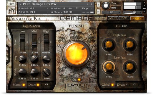 DAMAGE 提供了 30GB 风格剧烈化的工业之声以及交响鼓组,并将它们融入到密集电子原声之中。 Percussive Kits 打击乐组有着超过200款经过深度采样的打击乐声源,以及超过500款单击元素,每一个鼓声都由7层力度层组成,并附以9个样本的 round-robins。
