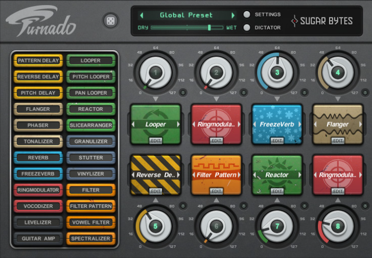 保持简单!Turnado配有8个旋钮,每个旋钮都会激发效果,并通过表盘进行更改。它邀请一种或多种效果进行游戏和实验。在专家模式下自定义24种效果。如果你想要它更紧凑:在独裁者模式下,你可以用一个推子同时控制所有8个效果。