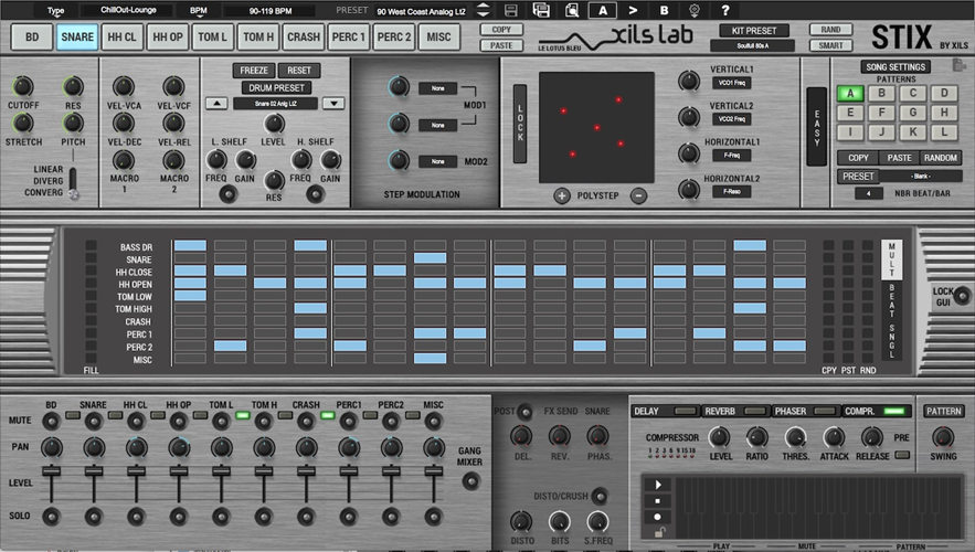 工作流程:快速直观。XoX序列器多行和单行视图,合成简单和高级视图。您只需单击一下即可完成任务。独家拉伸和模态音高宏控制,全局用户定义的宏控制,可轻松定制每个声音。混音器始终可见,合成面板之一、音序器视图之一、模式库和所有鼓垫始终可见。