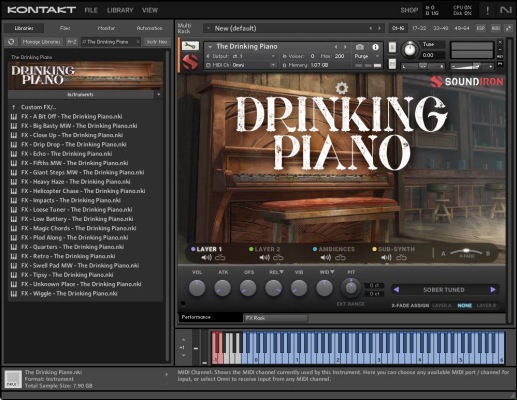Soundiron The Drinking Piano 是一个钢琴音源库,它模拟了一种老式的啤酒厅的声音,让人想起19世纪末和20世纪初的酒馆、拉格泰姆、乡村音乐和无声电影的音乐。它采样了一架历史悠久的纯桃花心木制的 Ivors and Pond 超大型立式钢琴,它有着一百年来被疯狂演奏的痕迹。每个键都有一个独特的老化的特征,键盘的动作松散,阻尼器不可靠,锤子机制松动,毡布磨损,还有很多灰尘。它用大振膜麦克风在一个小的有一点反射的大厅里录制,捕捉了近距离的干净的录音室录音的氛围,同时在尾音中留有一点现场的氛围。