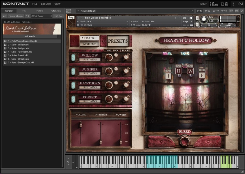 Hearth and Hollow Folk Voices在Native Instruments Kontakt(版本7.7.3或更高)中运行,支持在Windows 10及更高版本的PC和macOS 11及以上版本的Mac上运行。提供VST3、AU和AAX插件版本,以及独立应用程序。这个库需要6.23GB的空间。