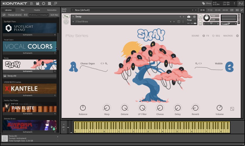 在直观的 Play 系列乐器中获得注入灵魂、颗粒感的嘻哈风味。SWAY 建立在嘻哈风格独特的钢琴、吉他、合成器和铃铛的采样之上,经过模拟设备深度的处理,具有颗粒感、洗礼后的氛围。通过数十种悠闲的旋律预设激发灵感,并通过宏控制、可定制的效果链和可编辑的放置序列深入调整。