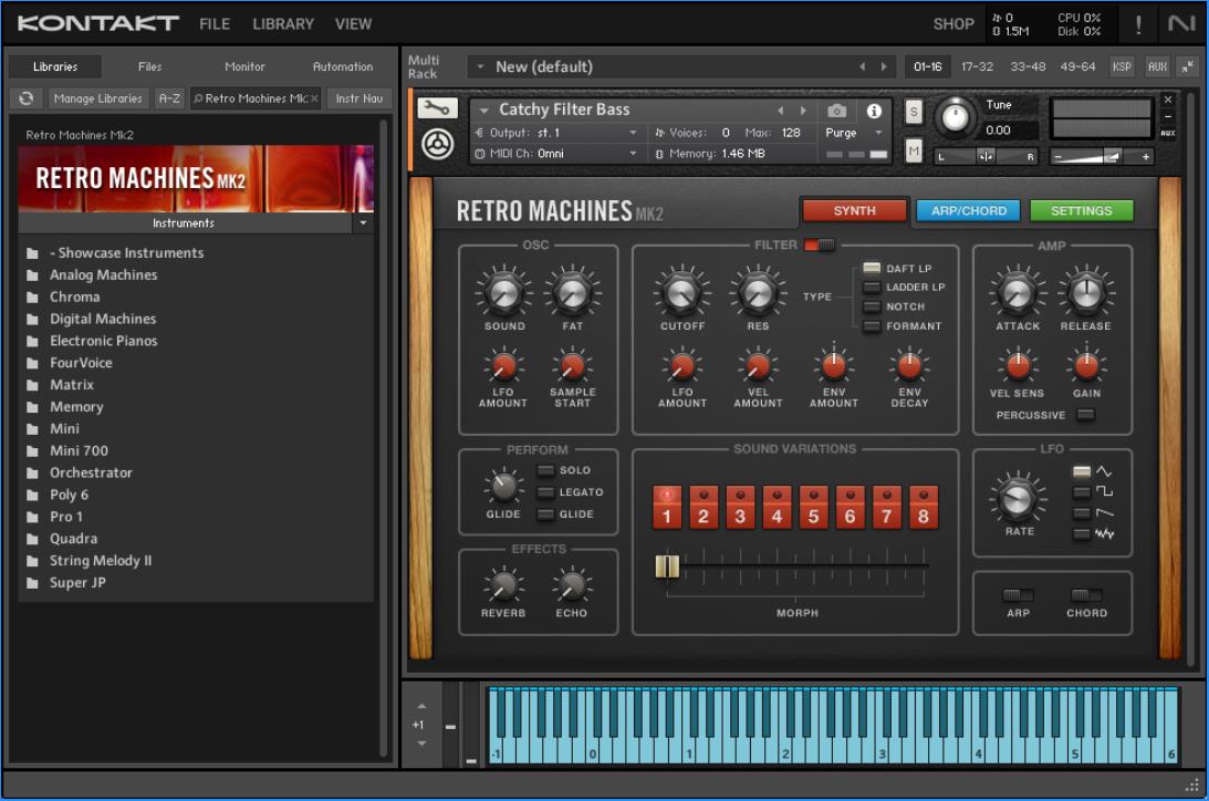 界面提供一致的控制,无论您目前正在调整哪种复古风格。 每个预设都可捕获原型乐器的声音,并具有八种集成的声音变化。 每种变化都是一种可以立即投入使用的合成声音,是OSC、滤波器、放大器和其他设备的特定组合。 您的调整会保存在每个音色变化中,您可以使用Morph滑块在动态声音的音色变化之间切换。