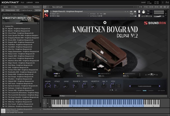 Soundiron Delphi Piano 02 Knightsen Boxgrand 是一款基于 Kontakt 的虚拟钢琴音源,它采样了一架罕见的老式立式钢琴,拥有独特的声音和氛围。这款音源不仅提供了原始的钢琴音色,还包含了由钢琴声音加工而成的多种环境垫音、无人机、冲击音效等,适合用于创造性的音乐制作和声音设计。