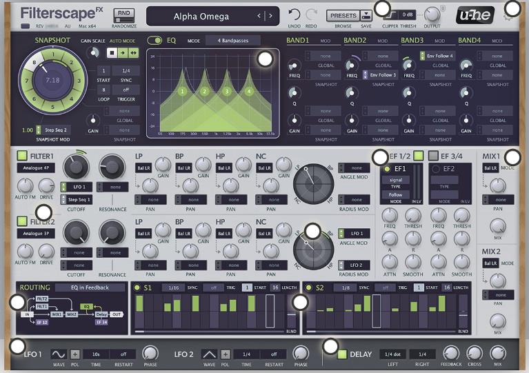 Filterscape 是主要的插件,它包含了两个多模式滤波器,一个四段参数均衡器,一个立体声延迟效果,以及两个信号混合器。它还有一个独特的特性,就是可以在八个不同的“快照”之间无缝过渡,这些快照是用户自定义的均衡设置。Filterscape 还可以动态地调制每个均衡带的频率和幅度,甚至可以从不同的输入源获取调制信号。