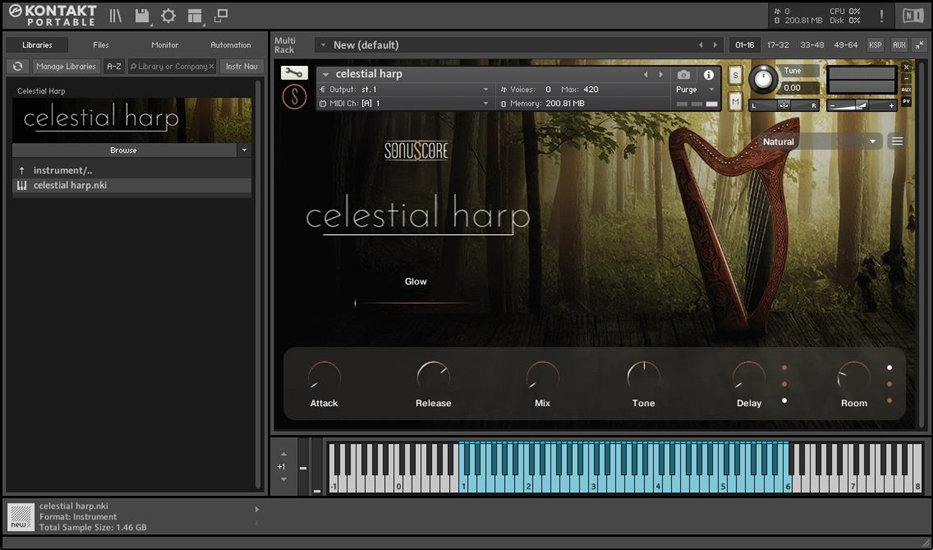 Sonuscore Celestial Harp 是一种基于 Kontakt 的音色库,它提供了一种凯尔特竖琴的声音,可以通过 GLOW 引擎将传统的拨弦声转变为全方位的空灵垫音。Sonuscore Celestial Harp 的声音能够唤起童话世界和天堂般的地方,适合用于幻想风格的音乐创作。Sonuscore Celestial Harp 包含了两种演奏技巧:自然和泛音,以及 10 种预设,可以调节启动、释放、动态范围、混响、延迟等参数。