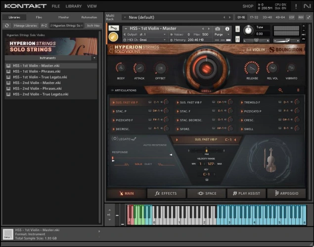 这个音源库包含了第一小提琴和第二小提琴,每个小提琴都有主音色、短语和真正连奏的预设。主音色包含了多种发音方式,每种发音方式都有自己的可实时调整的选项、按键切换和映射选项和演奏工具。这些主音色让你可以在延音、各种短音和自然动态的基于速度的表情之间无缝地混合和切换。延音发音方式提供了多种延音类型,有不同速度和强度的颤音,大部分都是自然地录制了钢琴和强音两种力度。另外还包括了一个完整的带消音器的发音方式部分,有延音、表情和短音。短音发音方式包括断奏、跳弓、拨弦、贴弓、木棒敲击、巴托克拨弦等等。