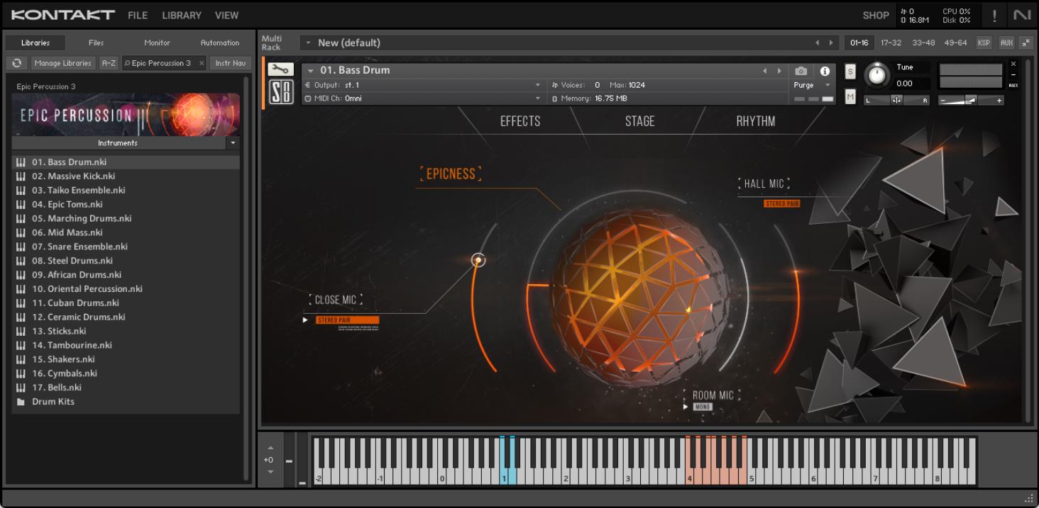 Epic Percussion 3 是一款全新的电影级打击乐器。它包含了 3 套鼓组 和 17 种独立打击乐器。这个库的一个新特性是声源位置控制系统,允许你在舞台空间内移动任何一个乐器。它的“Epicness旋钮”算法使其非常适合经典管弦乐配乐,同时也适用于现代激烈的预告片音乐。