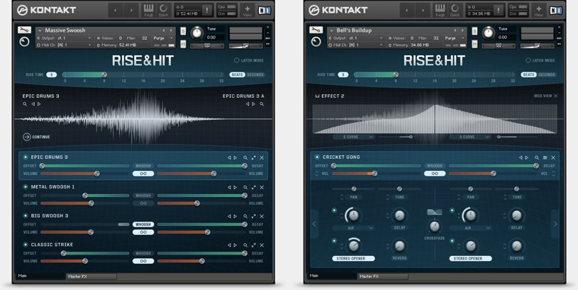 最多可组合四个声音层,以实现复杂而有层次质感的构建和峰值。 RISE&HIT中的每种声音都可以通过多个采样长度进行根本拉伸而不会降低质量。 从快速短暂的“whoosh”到32拍的上升,所有声音都保留了原始的音色。