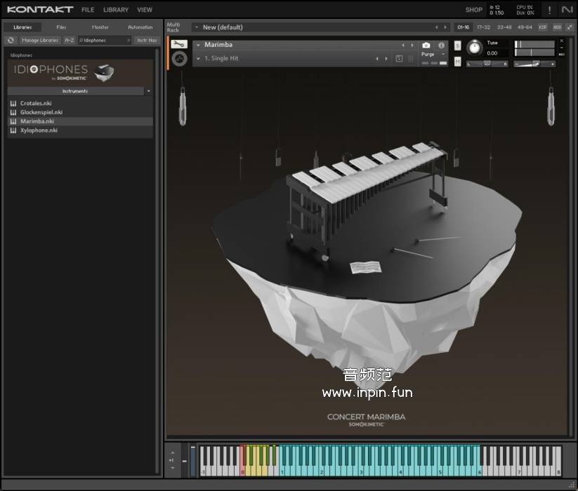 Sonokinetic Idiophones 是一套深度采样的打击乐器音色库,包括马林巴琴、木琴、钟琴和小钹。这些乐器拥有大量的循环采样(round robins),并且配备了一个内置的序列器和颤音发生器,以及对多种捕获的麦克风类型的深度控制。