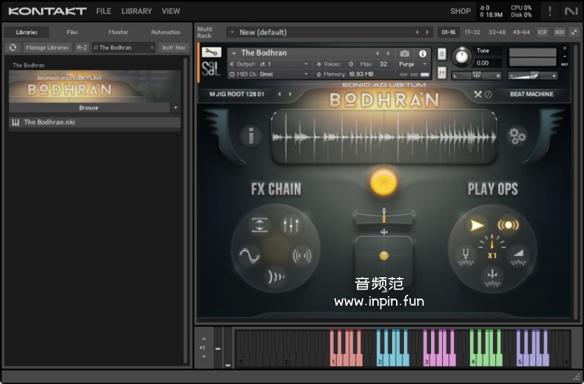 Sonic Ad Libitum 的 The Bodhran 是一个为 Kontakt 设计的打击乐音色库。这个库包含了110个完整的乐句(grooves),进一步细分为440个可切片的部分,提供了几乎无限的节奏组合可能性。