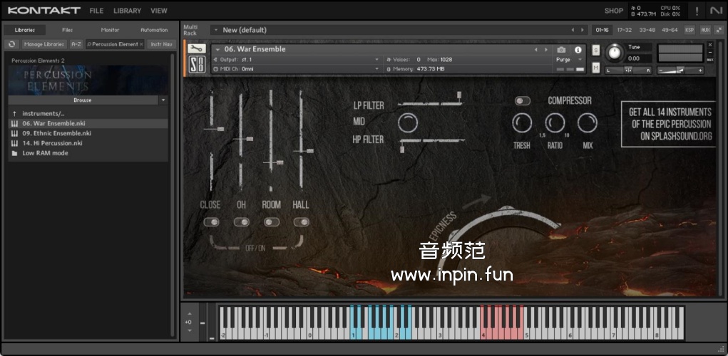 Splash Sound的Percussion Elements 2是一个为Kontakt设计的打击乐音色库,它提供了丰富的打击乐器样本,适用于各种音乐制作和声音设计。这个库包括从War Ensemble到Hi Percussion的多种打击乐器,以及4个麦克风位置(Close / Overhead / Room / Hall)的组合,使您能够根据创意需求选择合适的声音。从近距离干燥的声音到长时间的大厅混响,都能满足您的需要。