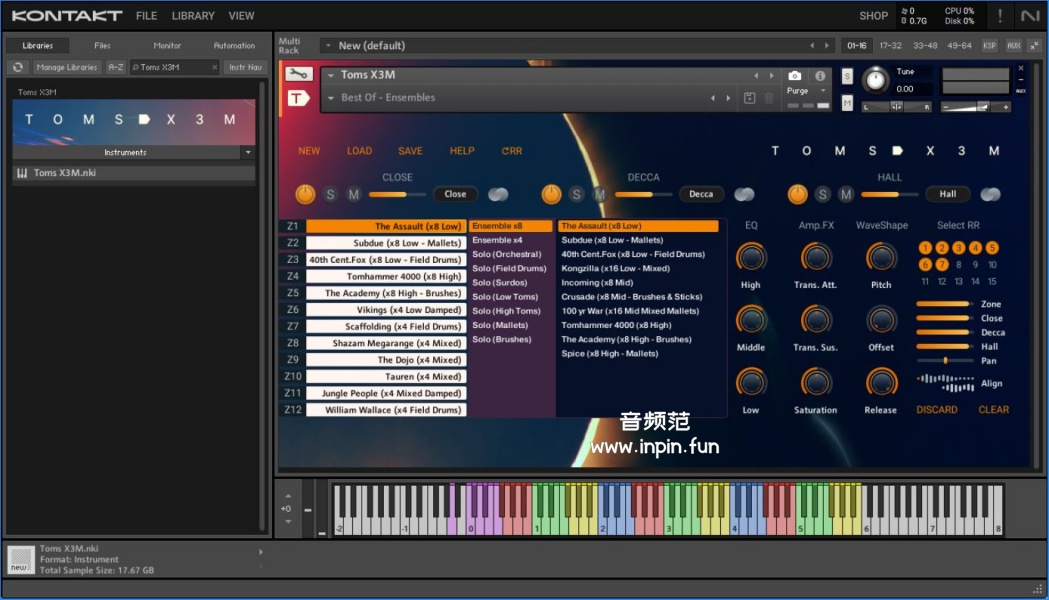 - X3M打击乐引擎:键盘范围被划分为12个区域,你可以将不同的声音分配到这些区域。此外,引擎还允许你调整单个区域或整个合奏补丁的各种效果和麦克风位置。