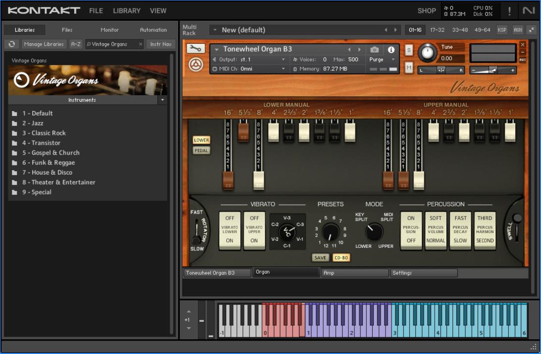作为KOMPLETE乐器和效果器家族中的一员,VINTAGE ORGANS包括哈蒙德(Hammond®)的B-3、C-3和M-3、Vox Continental™和Farfisa® Compact型号,从Native Instruments独家的原型乐器中以最高的声音质量录制而成。 管风琴(Organ)和音箱(Amp)界面通过拉杆、打击(percussion)、合唱/颤音、过载、旋转效果、包络、EQ和混响控制,为你提供了声音的完整控制。