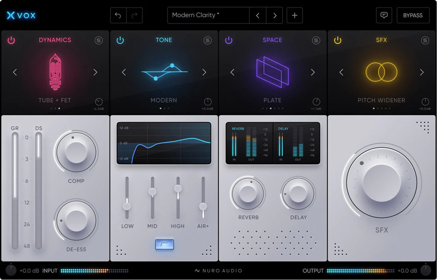 Nuro Audio Xvox 是一款先进的声道插件,适用于专业的人声混音。它集成了多种功能,包括压缩、去嘶、均衡、混响、延迟和特效,让你可以快速轻松地打造出任何风格的人声音色。