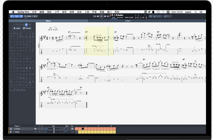 Guitar Pro提供了许多阅读功能:3种类型的符号(标准/tablature/斜杠),缩放和虚拟指板/键盘,以可视化手指在其上的精确位置。