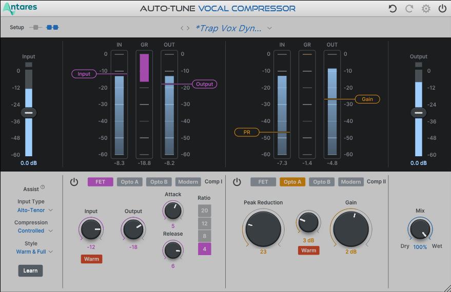 使用内置的暖音功能将电子管饱和度和谐波的舒适氛围应用于一个或两个压缩器的人声。