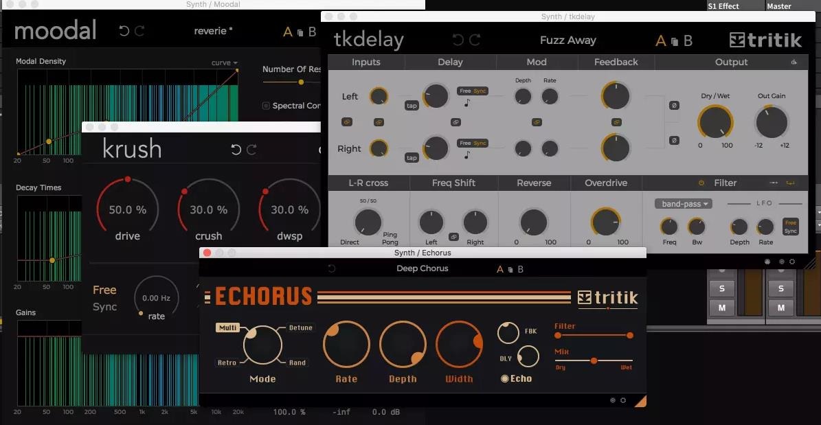 Tritik Complete Bundle 是一套音频插件,包含了六种不同的效果器,分别是 Echorus、Flaw、Irid、KrushPro、Moodal 和 tkDelay。这些插件可以为你的音乐和音效制作提供高质量的处理和创意功能。以下是每种插件的简要介绍: