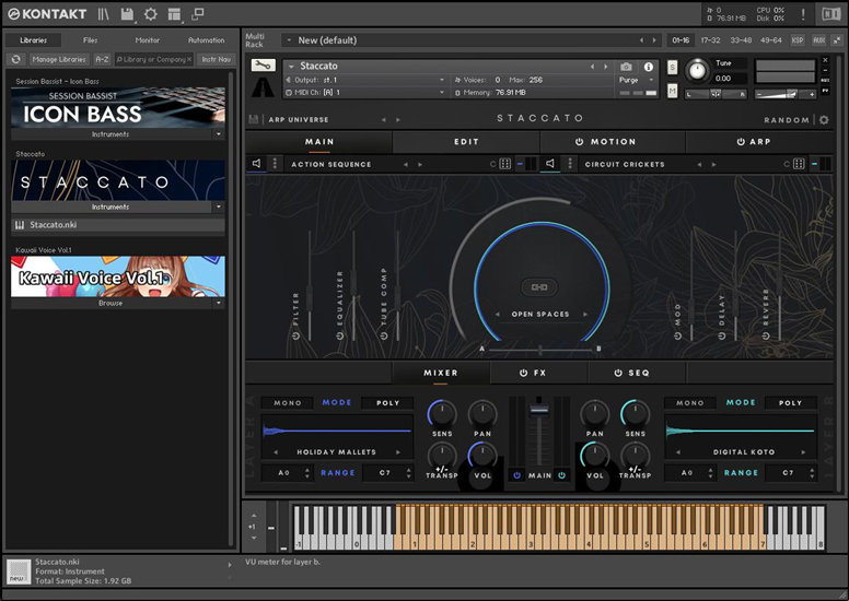 Artistry Audio Staccato 是一种基于 Kontakt 的音色库,它提供了一种短促的合成器运动引擎,可以用来创造独特的拨弦、键盘、合成器等声音。