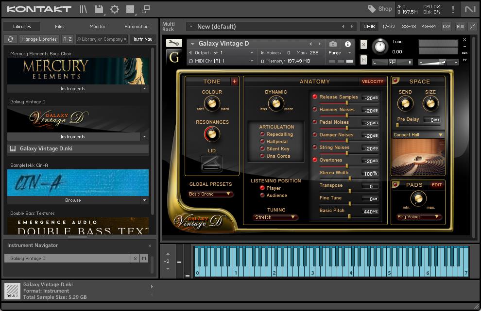 曾经弹奏过这款古老的三角钢琴的钢琴家包括 Keith Jarrett, Chick Corea, Joe Sample, Abdullah Ibrahim, Carla Bley, Ralph Towner 和 Richie Beirach 等大师,后者称它为“世界上最好的钢琴”。Galaxy Vintage D 的采样过程由爵士钢琴家 Tobias Dehler 完成,他用了五天的时间演奏了大约 2100 个采样。