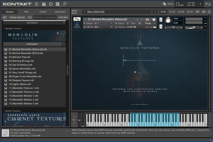 这款乐器有15个nki文件,其中两个是标准的闷音曼陀林声音,非常自然和实用。