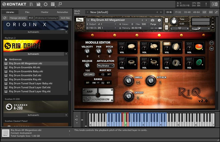 对于我们的Riq Drum多样本库,我们捕获了一对全尺寸鼓,一个来自希腊的较大的15英寸“daf”鼓,带有金属环和轴承(实际上称为daf),以及一个来自埃及的较小的13英寸riq鼓,带有宽锡“钹”。我们还捕获了一个玩具框架鼓,通过添加摇蛋器,将其修改为微型riq。我们还收集了完整的大气和环境维持仪器,每个仪器都是通过大量操作该库的源录音而创建的,并配备了多层变形,性能整形和FX链接选项。