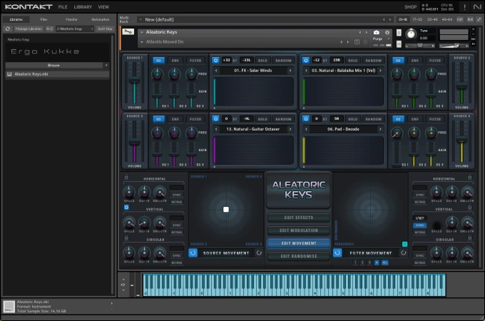 Ergo Kukke Aleatoric Keys 包含了四个可单独调节的采样源,每个源都有大量的可调制参数。它还有两个操纵板,分别控制源的增益分布比和滤波器的截止频率和谐振,让您的音乐更加生动和动态。它还有九种不同的效果模块,包括合唱、失真、低保真、延迟、空间、滤波器、相位器、卷积混响和调谐法兰格¹³。它还有一个随机化功能,可以让您快速生成一些独特的声音。