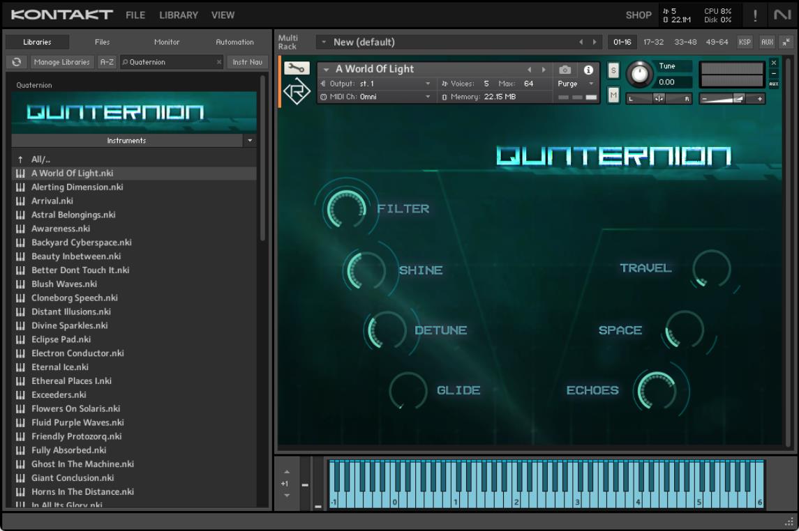 Rigid Audio 的 Quaternion 是一个为 Kontakt 设计的音乐插件,它提供了72个预设(Kontakt 乐器),这些预设分为三个类别:温暖的(Heartwarming)、威胁的(Menacing)和超自然的(Unearthly)。Quaternion 建立在超过347个源 WAV 音频文件之上,提供了对空间(混响)和回声的控制,类似模拟的音符失谐,音符滑动和旅行(播放速度)旋钮,低通滤波器和闪耀旋钮(共振控制)。
