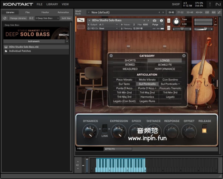 此外,8Dio Studio Quartet Series Deep Solo Bass 提供了一个内置的浏览器系统,使用户能够轻松访问和加载所需的演奏技巧。所有的演奏技巧被组织在六个核心类别中:短音符(Shorts)、长音符(Longs)、弓法(Bowed)、弓法效果(Bowed FX)、测量(Measured)和表演(Performance)。