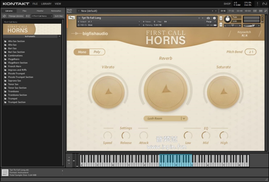 Big Fish Audio的First Call Horns 2.0是一个先进的虚拟号角乐器库,它提供了多种不同的号角声音,适用于多种音乐风格,包括爵士乐、大乐队、摇滚和流行音乐。这个库让你摆脱传统管弦乐队铜管乐器的限制,寻找完美的号角声音。它包含了多种不同的演奏技巧和动态层次,使得音色更加丰富和真实。
