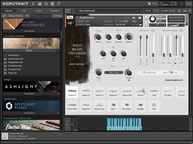 Solo Brass Untamed 的核心是 Improvisations,即即兴演奏。这些不是旋律性的短语或预先编写的音乐,而是带有意图、人类能量和自然运动的单个音符。每个音符都有三种不同的动态层,通过键盘速度触发。每层还有四种不同的变化,因此每个音符有 12 种完全独特的演奏方式。在五种乐器中,总共有超过 1600 个即兴演奏。