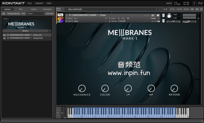SyrinxSamples 的 Membranes: Mark 1 是一个基于 Rhodes Mark 1 电钢琴的样本库。这个库非常细致地采样了每个键和每个声音,提供了两个补丁:Clean 和 Amped。使用这些补丁,您可以获得该乐器的清晰、纯净声音,或者通过经典的 Fender 组合放大器和 Shure SM57 及 Senheiser MD421 麦克风塑造的音色。此外,您还可以使用 Color 旋钮添加 Chorus 或 Overdrive,以及两种混响选项,Plate Reverb 和 Spring Reverb,这将允许您灵活地改变空间和音色!