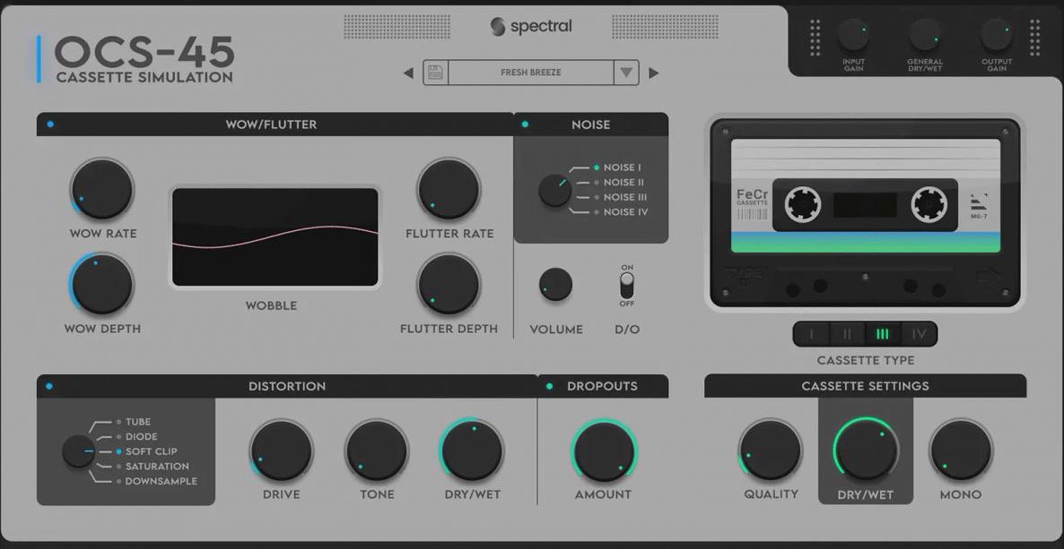 Spectral Plugins OCS-45是一款卡带模拟插件,提供各种Lo-fi声音,从怀旧的卡带模拟到创造性的失真效果。