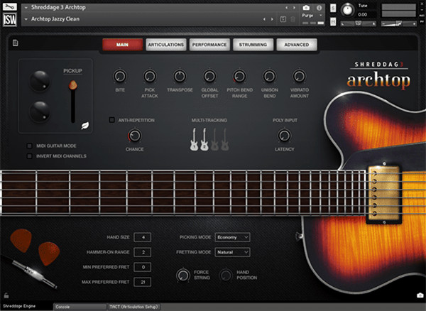 Shreddage 3 Archtop是一款虚拟电吉他乐器,适用于Kontakt,具有空心电吉他的声音,非常适合清音和放大的演奏,以及爵士、蓝调、R&B、放克、流行等风格。它是基于我们非常受欢迎的Archtop:hollobody电吉他乐器,并将其升级到我们的尖端S3引擎,一路上添加全新的样本。它还包括以下特点: