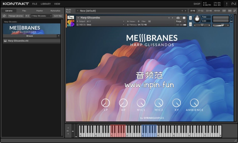 Membranes: Harp Glissandos 需要 NI Kontakt 6.1.1 或更高版本的完整版,并提供 Wav 格式(48kHz,24bit)。下载大小为 0.08Gb,未压缩大小为 0.1Gb。