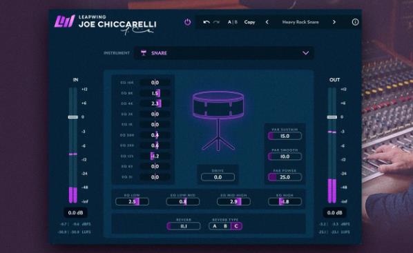 Leapwing Audio Joe Chiccarelli 是一款多效果插件,它捕捉了多次获奖的工程师和制作人 Joe Chiccarelli 的签名声音。它有 11 种不同的音色配置,分别适用于 鼓点、鼓边、鼓皮、鼓头、鼓室、贝斯直插、贝斯功放、原声吉他、电吉他、电钢琴和主唱。每种音色配置都有一组参数,可以控制 驱动、均衡、压缩、并行压缩和效果。它的界面简洁美观,操作方便,可以快速地获得专业的声音效果。