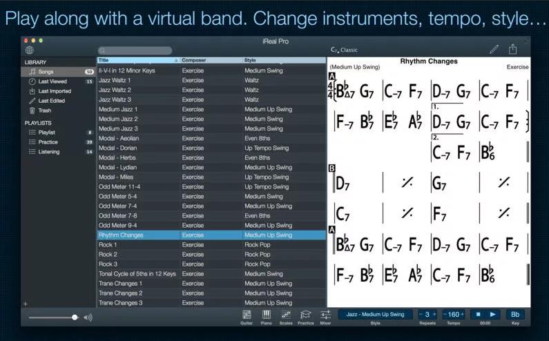 熟能生巧。iReal Pro 提供了一个易于使用的工具,可帮助所有级别的音乐家掌握他们的艺术。它模拟了一个听起来很真实的乐队,可以在你练习时陪伴你。该应用程序还允许您创建和收集您喜欢的歌曲的和弦图以供参考。
