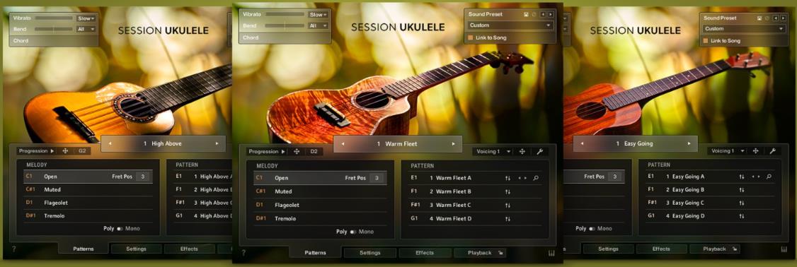 Session Ukulele 的音色取材自夏威夷与玻利维亚制琴师所打造的手工乐器。无论你追求的是明亮欢快的高音尤克里里音色、共振温暖的次中音音色,还是活泼的恰朗戈音色,每种乐器都带有独特的音色预设和 pattern,具备风格各异的声音个性。