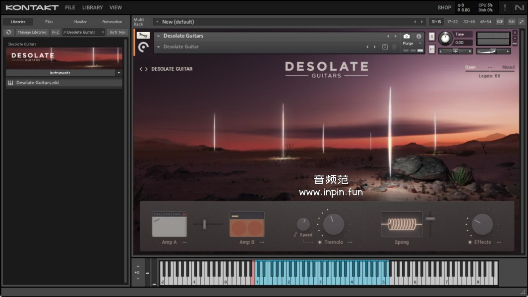 - 概念与声音设计:Desolate Guitars 以捕捉孤立、废弃、末世环境的精髓为核心,提供了一系列精心采样和处理过的电吉他和原声吉他样本,包括空灵的延音、诡异的弹拨、失真的即兴段落以及令人不安的效果。该乐器的音色库融合了有机暖度与数字处理的独特结合,完美平衡了自然主义与超现实主义的色调。