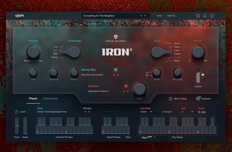 UJAM Virtual Guitarist IRON 2 的界面简洁易用,您可以在无需任何吉他技巧的情况下,通过选择不同的风格、短语、效果和调音来编程出逼真的吉他音轨。您也可以使用乐器模式,自己演奏吉他,并使用键盘切换来控制不同的演奏技巧,如弯音、滑音、闷音等。