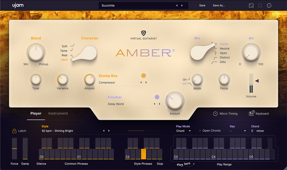 uJAM Virtual Guitarists AMBER 2 可以让你快速地得到专业水准的吉他轨道,无需任何吉他或音频技巧。它适合用于创作温暖、舒适、感性的吉他伴奏,无论是亲密的独立歌曲,还是宏大的流行抒情曲,或者是传奇的摇滚赞歌。